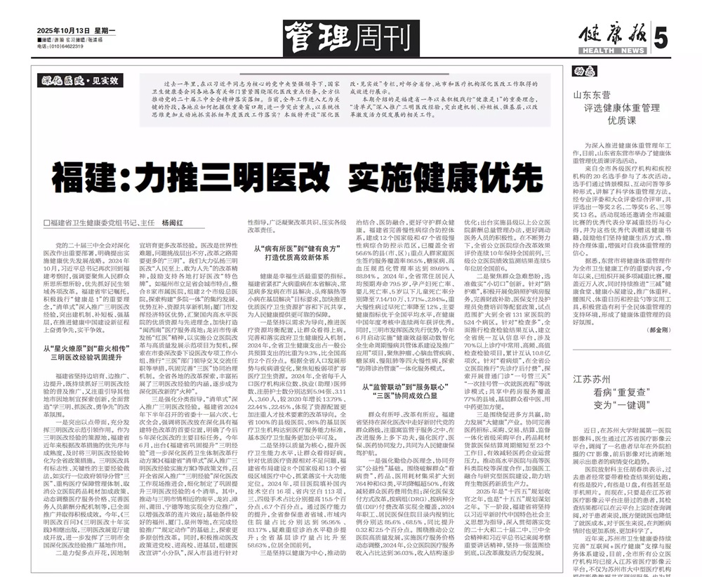 三是坚持以健康为中心,推动防治结合、医防融合,更好守护群众健康。福建省完善慢性病综合防控体系,建成12个国家级和47个省级慢性病综合防控示范区,已覆盖全省56.6%的县(市、区);重点人群家庭医生签约服务覆盖率86.5%,糖尿病、高血压规范化管理率达到89.69%、88.84%。2024年,全省常住居民人均预期寿命79.5岁,孕产妇死亡率、婴儿死亡率、5岁以下儿童死亡率分别降至7.14/10万、1.71‰、2.84‰,重大慢性病过早死亡率降至12%,主要健康指标优于全国平均水平,在健康中国年度考核中连续两年获评优秀。同时,三明市发挥医改先行优势,今年6月启动实施“健康效益驱动数智化全生命周期慢病共管体系建设及推广应用”项目,聚焦肿瘤、心脑血管疾病、糖尿病、慢阻肺等四大慢性病,探索“防筛诊治管康”一体化服务模式。