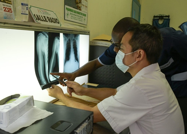 影像科医生江文匡与当地医生一起查看患者的影像检查结果。