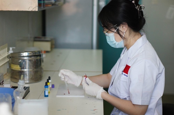 检验科医生彭捷鉴定患者血液样本。