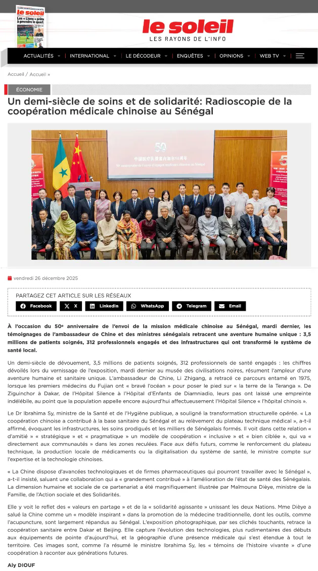2025年12月26日,塞内加尔主流媒体《太阳报》刊登题为《半个世纪的医疗援助与团结互助:深度解读中国对塞内加尔医疗合作》的文章,全文如下: