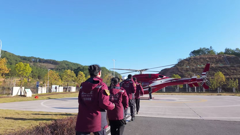 11月20日,原本预设为“直升机运送专家远程支援长汀1名急性心肌梗死抢救”的演练科目。演练即将开始,协和医院突接福建省汀州医院真实求助消息,一名70岁女性患者诊断为冠心病、不稳定型心绞痛,冠脉钙化严重,病情危重,介入手术难度系数高,地面转运超过5小时风险大,向协和医院请求专家支援。经演练团队联合研判,迅速决定将演练转实战,由协和医院立即按需调派专家团队。省卫健委应急处快速协调省航空应急救援中心,完成天气研判、航前准备与空域申报,协和医院专家团队搭乘救援直升机从协和医院旗山院区起飞,仅用97分钟飞抵闽西革命老区县长汀,为危重症患者赢得了决定性的抢救窗口时间。专家团队下机后迅速进入导管室,与本地团队共同投入急诊手术,从直升机起飞到手术结束仅用时3小时,手术顺利,患者生命体征恢复平稳。科目一由演练科目无缝转为实战的极限救援,展示了整个航空医疗救援团队的应变调度能力。
