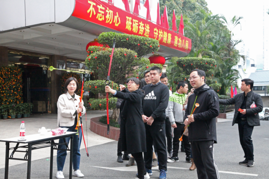 随着委党组成员方少雄的一声令下,文体活动在拔河比赛的阵阵加油声中拉开了序幕。随后,巧运乒乓球、百步穿杨、飞镖达人、垃圾分类投壶、推杯子、趣味保龄球等闯关文体项目也吸引了众多职工的积极参与,现场热闹非凡,气氛热烈,笑声不断。活动还邀请了委机关书法爱好者为大家现场撰写春联,迎春纳福、翰墨飘香,让大家感受到传统过年的喜庆气息,真切体验到了传统文化的魅力。浓浓的年味和闯关获得“战利品”后的喜悦写在一张张笑脸上,整个活动呈现出欢乐喜庆的景象。
