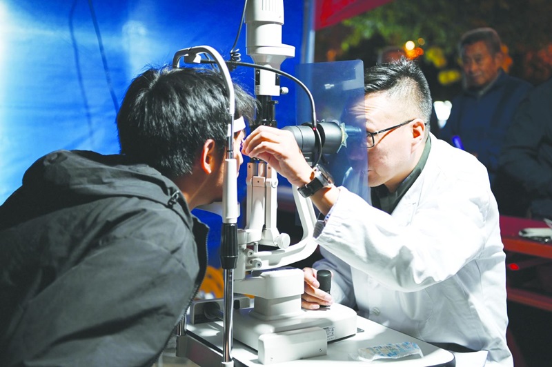 义诊摊位上,为市民检查眼部健康状况。(张俣辰 摄)