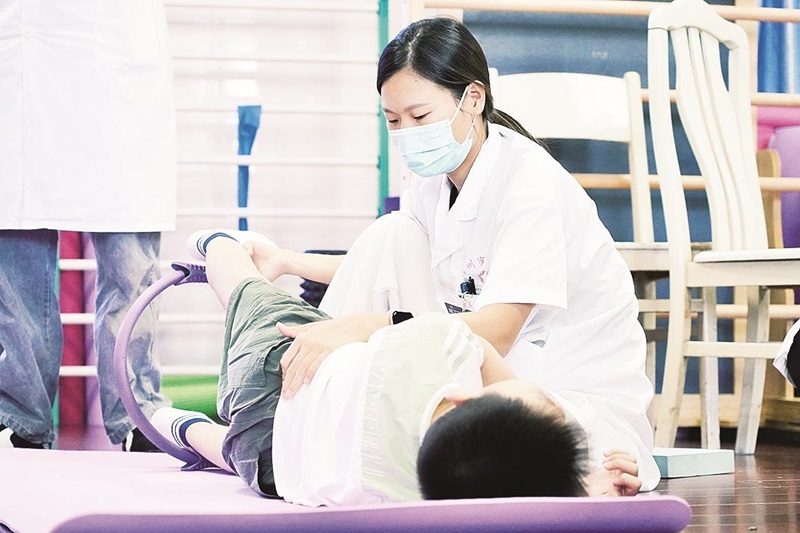 “我们采用中药调理脾胃功能以强健筋骨,配合针灸疏通经络、缓解疼痛与肌肉紧张,并结合推拿整脊手法调节双侧肌力平衡,达到‘骨正筋柔’的治疗目标。再配合现代康复训练,效果显著。”推拿区医师许丹枫介绍说,他与康复区的同事朱立共同担任婷婷的主治医师。