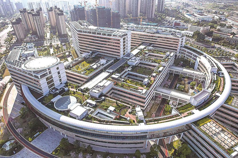 鸟瞰省儿童医院,这座以“圆”为主题设计的医院,宛如一朵盛开在城市版图上的向日葵。
