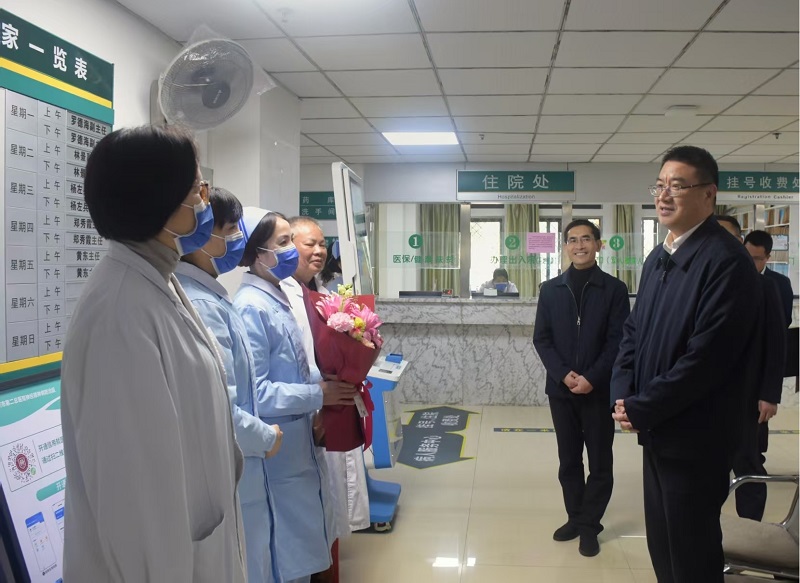 在福建省肿瘤医院调研时,杨闽红看望慰问重点项目建设一线工人以及临床医护人员。他强调,要高标准、高质量推进肿瘤防治综合大楼重点项目建设,确保工程安全、优质、高效完成,为国家肿瘤区域医疗中心建设提供坚实基础支撑。要持续深化肿瘤专科学科建设,推动临床技术与科研创新深度融合,加强高层次人才培养与团队协作,全力打造优势突出、特色鲜明的肿瘤诊疗高地,为守护人民群众健康提供更强有力的支撑。并勉励大家继续发扬爱岗敬业奉献精神,为健康福建建设贡献更多力量。