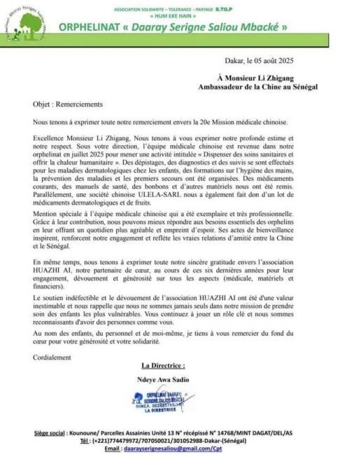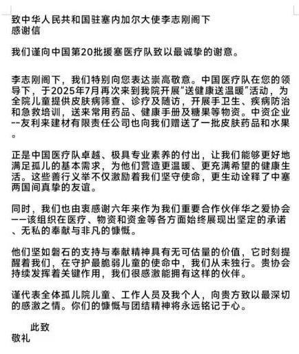 近日,驻塞内加尔使馆收到了一封来自当地孤儿院的感谢信,信中深情回顾了中国医疗队前往达阿里·塞林·萨利乌·姆巴克孤儿院开展“送健康送温暖”的公益活动,使馆随即将该信转给第20批援塞内加尔医疗队。这场跨越山海的爱心接力,为孤儿院的孩子们带去了健康和欢笑,也收获了非洲人民的感恩之情。