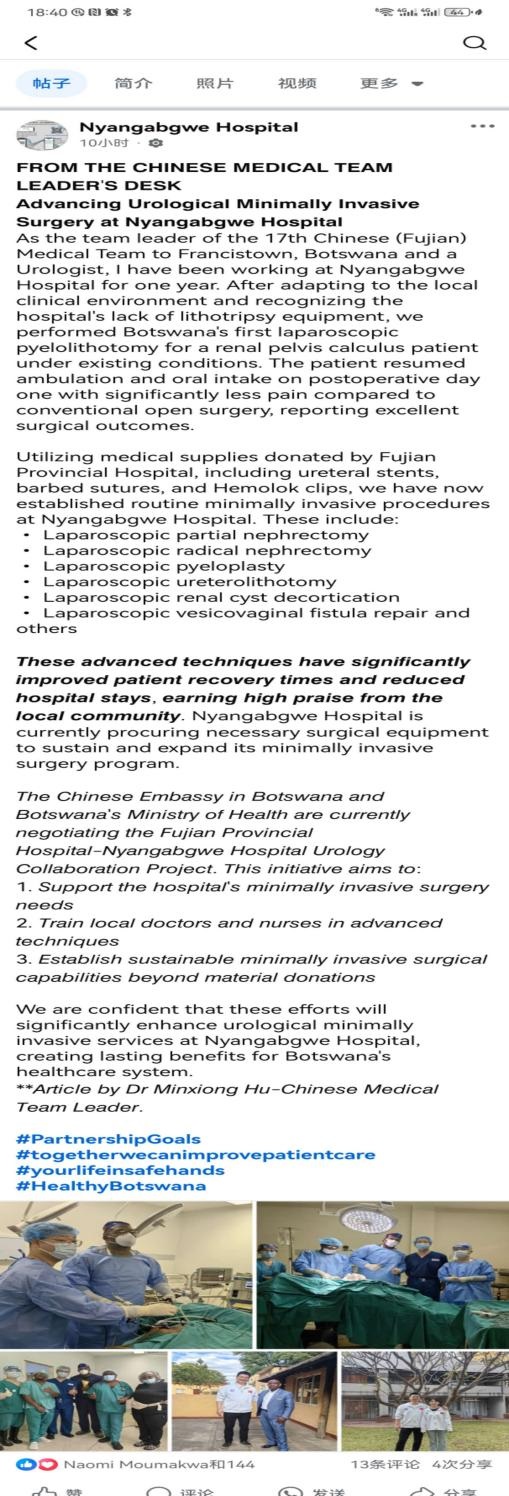 ▲博茨瓦纳仰佳圭转诊医院Facebook报道截图