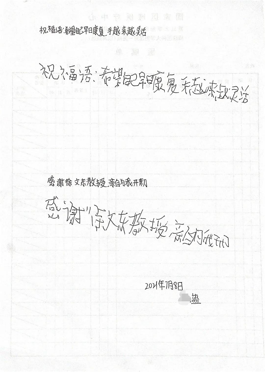 术后两位患者右上肢痉挛的状况均好转,患者和家属都露出了满意的笑容。小蓝还写下了歪歪扭扭但格外真诚的一行字:感谢徐文东教授亲自为我开刀。