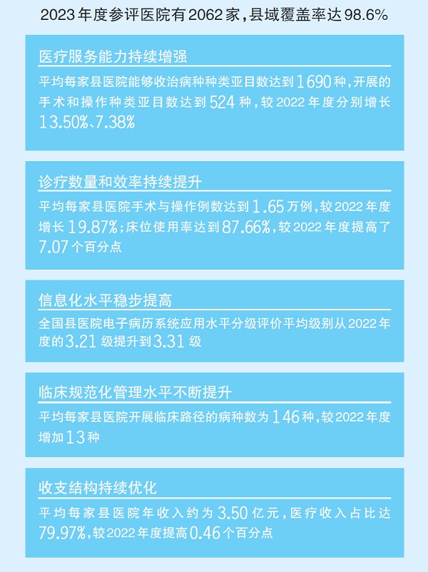 从评估报告可以看出,县域医疗资源共享和高质量管理水平不断提升,1198家县医院为县域医共体牵头单位,平均每家县医院医疗服务收入占医疗收入比例为31.25%,较2022年提高0.75个百分点。电子病历系统应用水平平均级别为3.55级、平均住院天数为7.35天、Ⅰ类切口手术部位感染率0.22%,均优于全国平均水平。