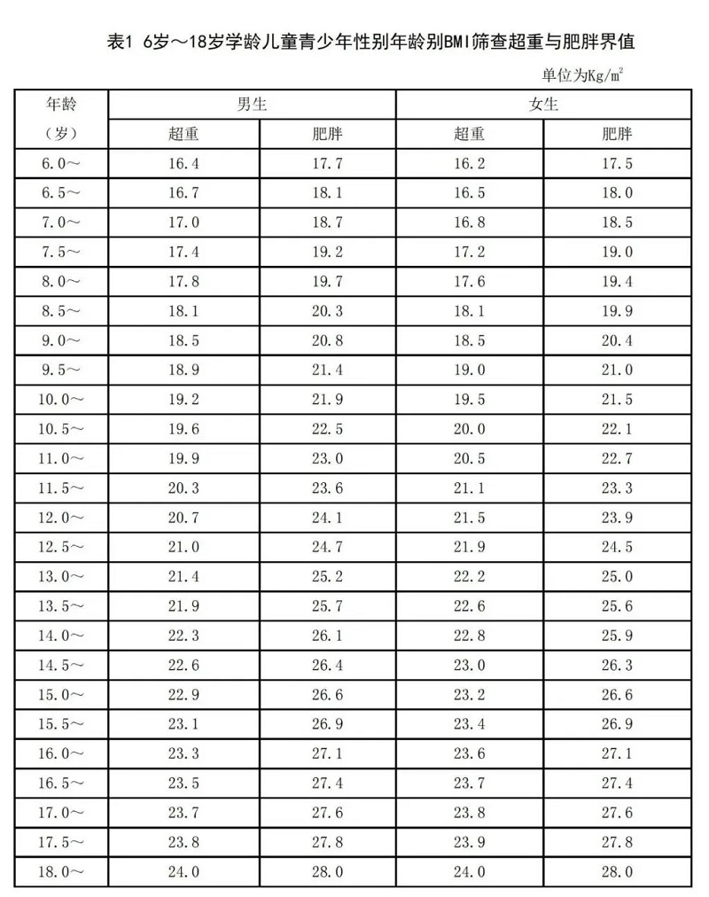 体质量指数(BMI)是国际社会推荐的评价儿童(≥2岁)超重和肥胖的首选指标,用体重(千克)除以身高(米)的平方即可。我国学龄儿童青少年超重和肥胖筛查BMI界限值如下表: