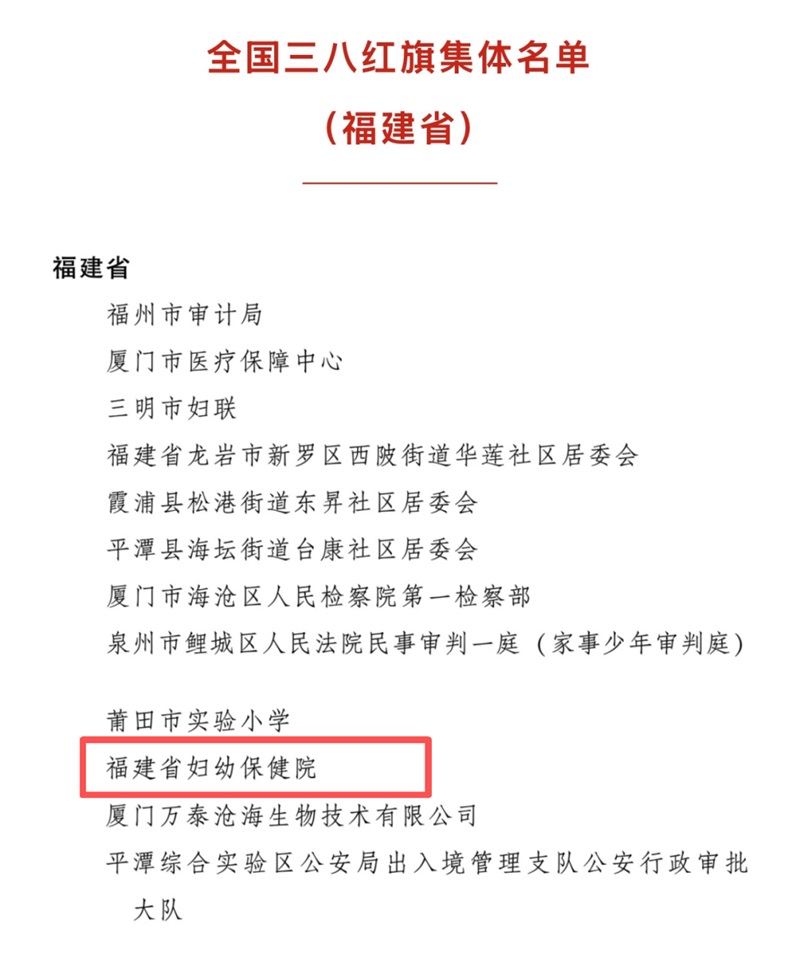 近日,福建省妇幼保健院被中华全国妇女联合会授予“全国三八红旗集体”荣誉称号。